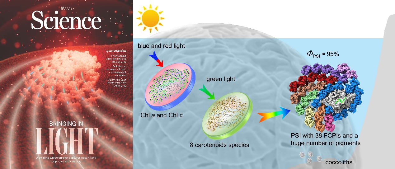 9月12日,國際學術期刊《科學》以封面論文形式發表了中國科學家的最新研究成果。中國科學院植物研究所王文達研究員和田利金研究員帶領團隊首次純化并解析了來自赫氏艾米里顆石藻(Emiliania huxleyi)的光系統I-巖藻黃素葉綠素a/c結合蛋白(PSI-FCPI)超級復合物三維結構,這一研究首次在原子層面揭示了顆石藻通過擴展和優化其光系統結構來適應海洋光環境的獨特策略,是光合生物適應進化研究中的一個重大發現。