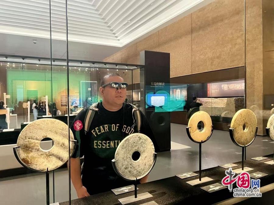 記者使用AR智能導覽眼鏡觀看良渚博物院中的展品。中國網徐林/攝影