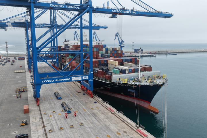 8月28日,在秘魯錢凱港碼頭,集裝箱船靠港裝卸。新華社發(伊萬·帕斯攝)