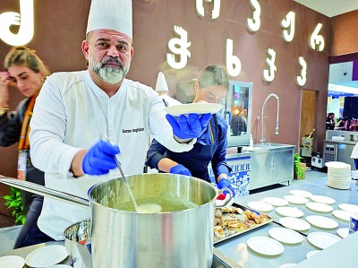 第八屆中國國際進口博覽會格魯吉亞展廳,展商與游客分享當地美食。光明日報記者 范天培攝/光明圖片