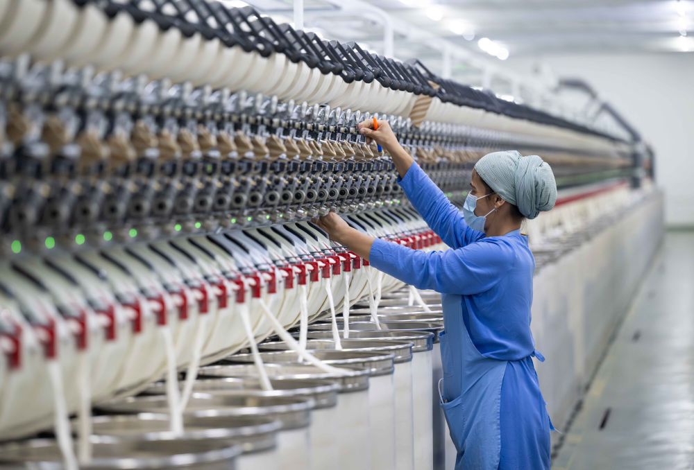 一名中方員工在中塔合作項目丹加拉農業紡織產業園的紡紗二車間工作。