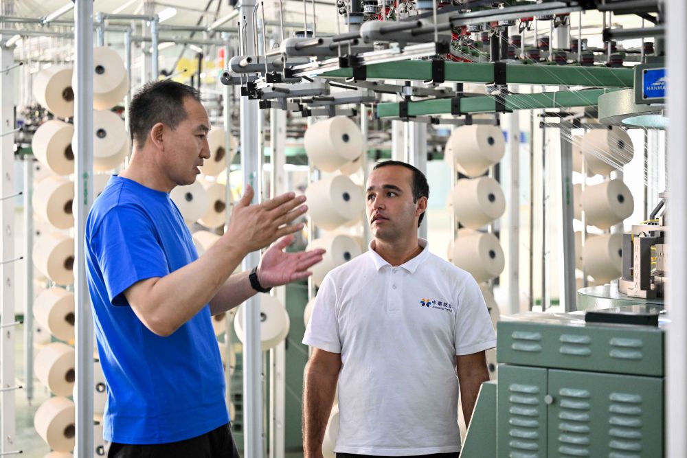 在中塔合作項目丹加拉農業紡織產業園的針織車間,中方員工指導塔方員工古夫龍(右)工作。