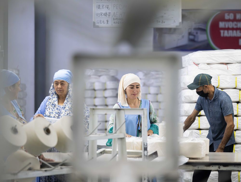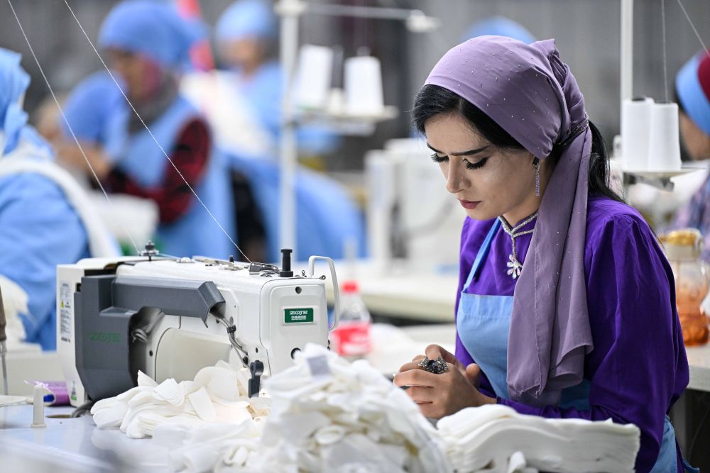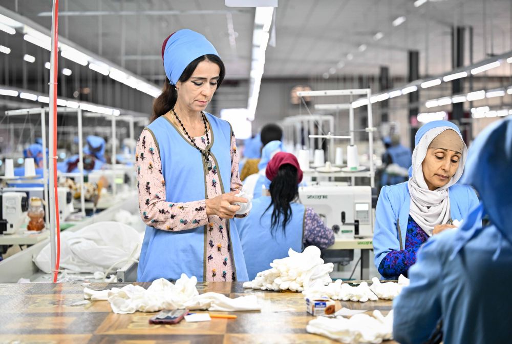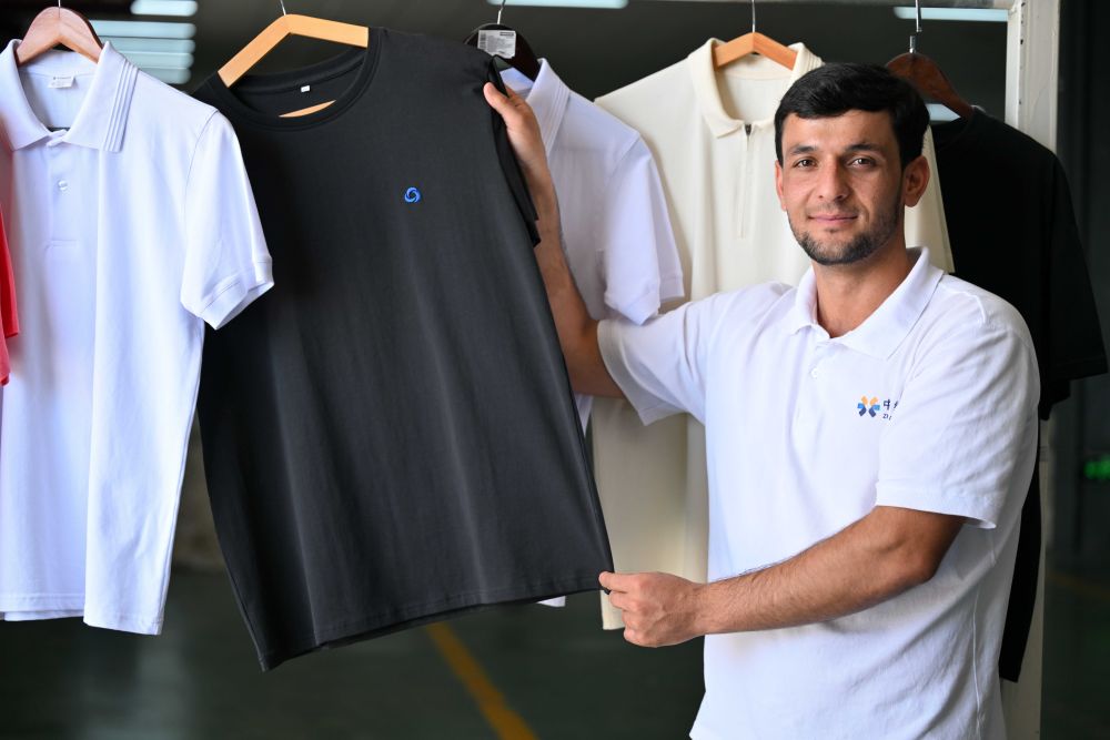 在塔吉克斯坦哈特隆州丹加拉區的中塔合作項目丹加拉農業紡織產業園,塔方員工卡尤莫夫展示成衣樣品。