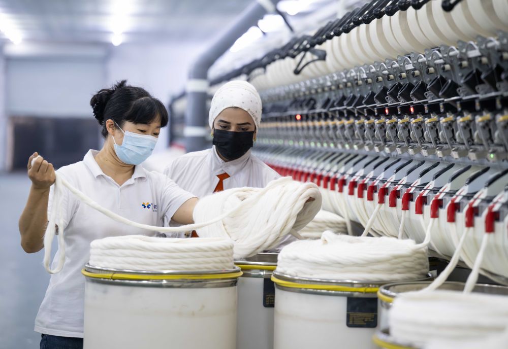 在塔吉克斯坦哈特隆州丹加拉區的中塔合作項目丹加拉農業紡織產業園,紡紗車間主任孫月輝(左)指導塔方員工依迪古。